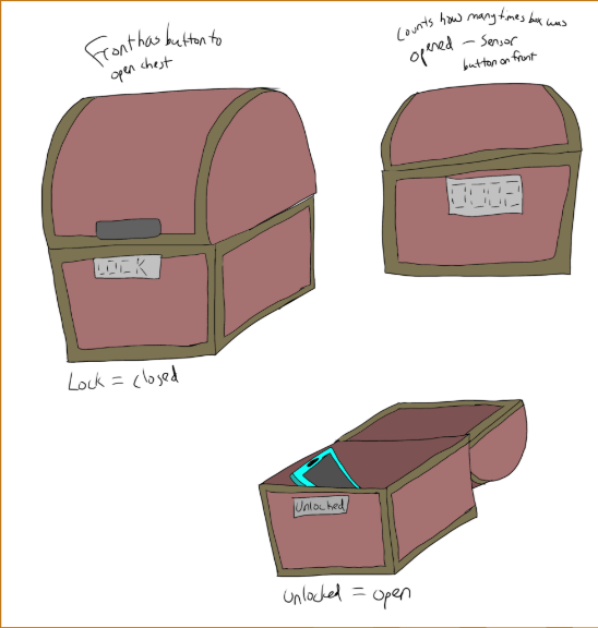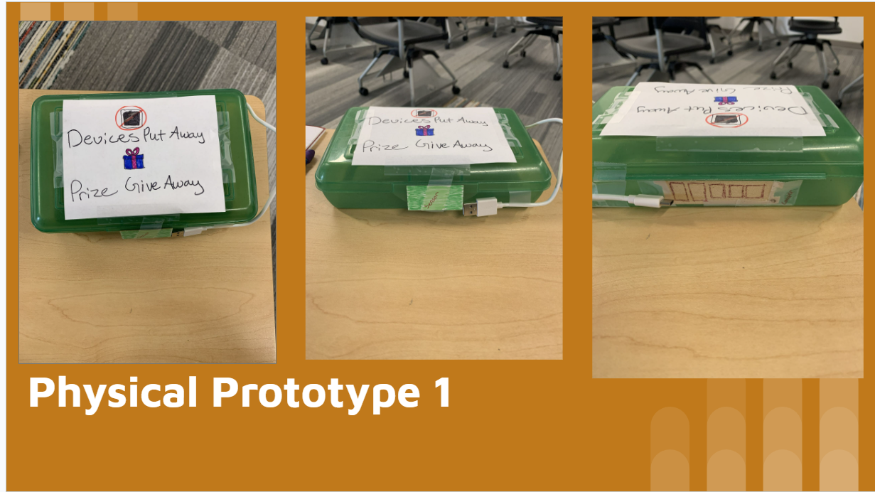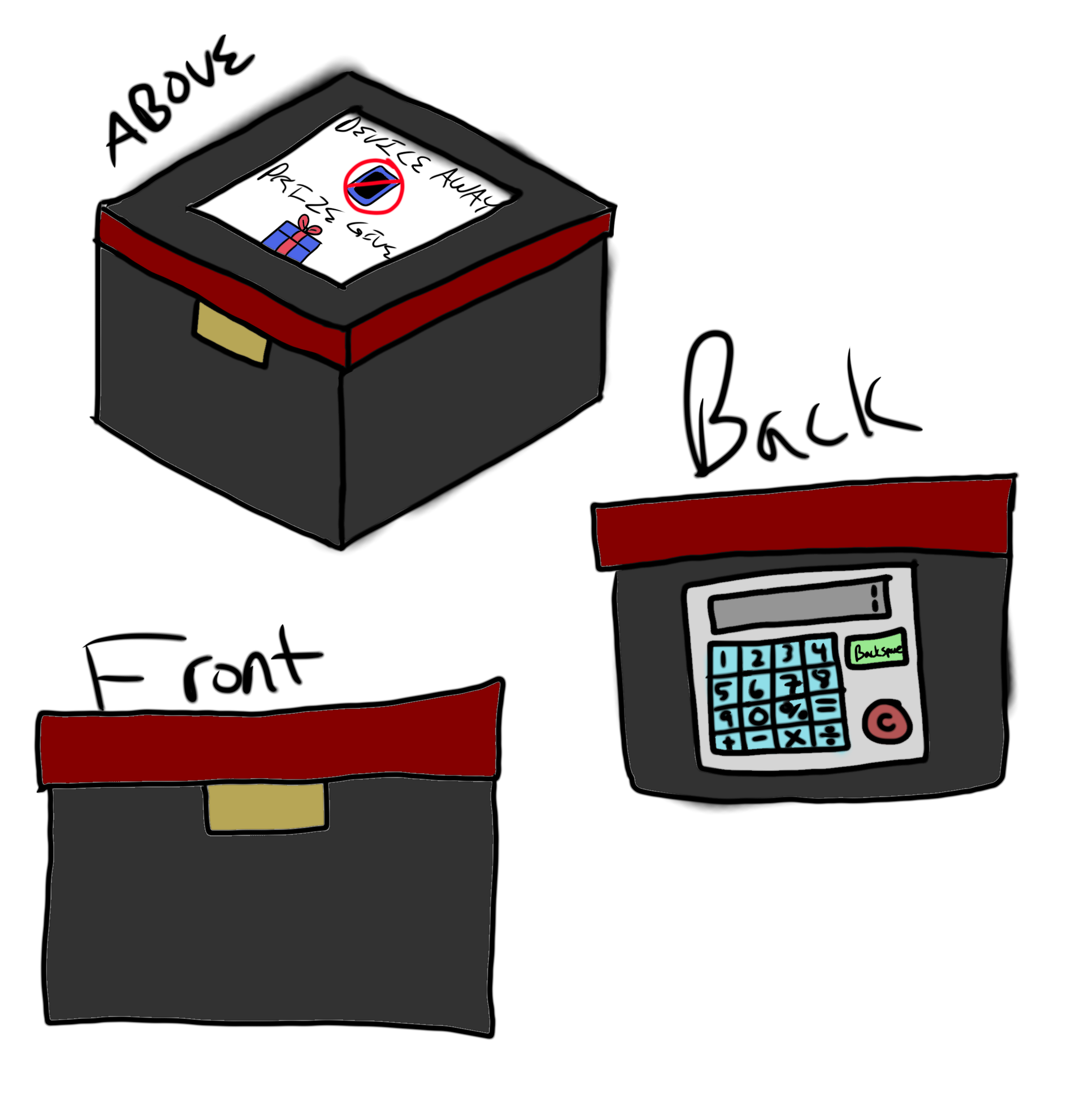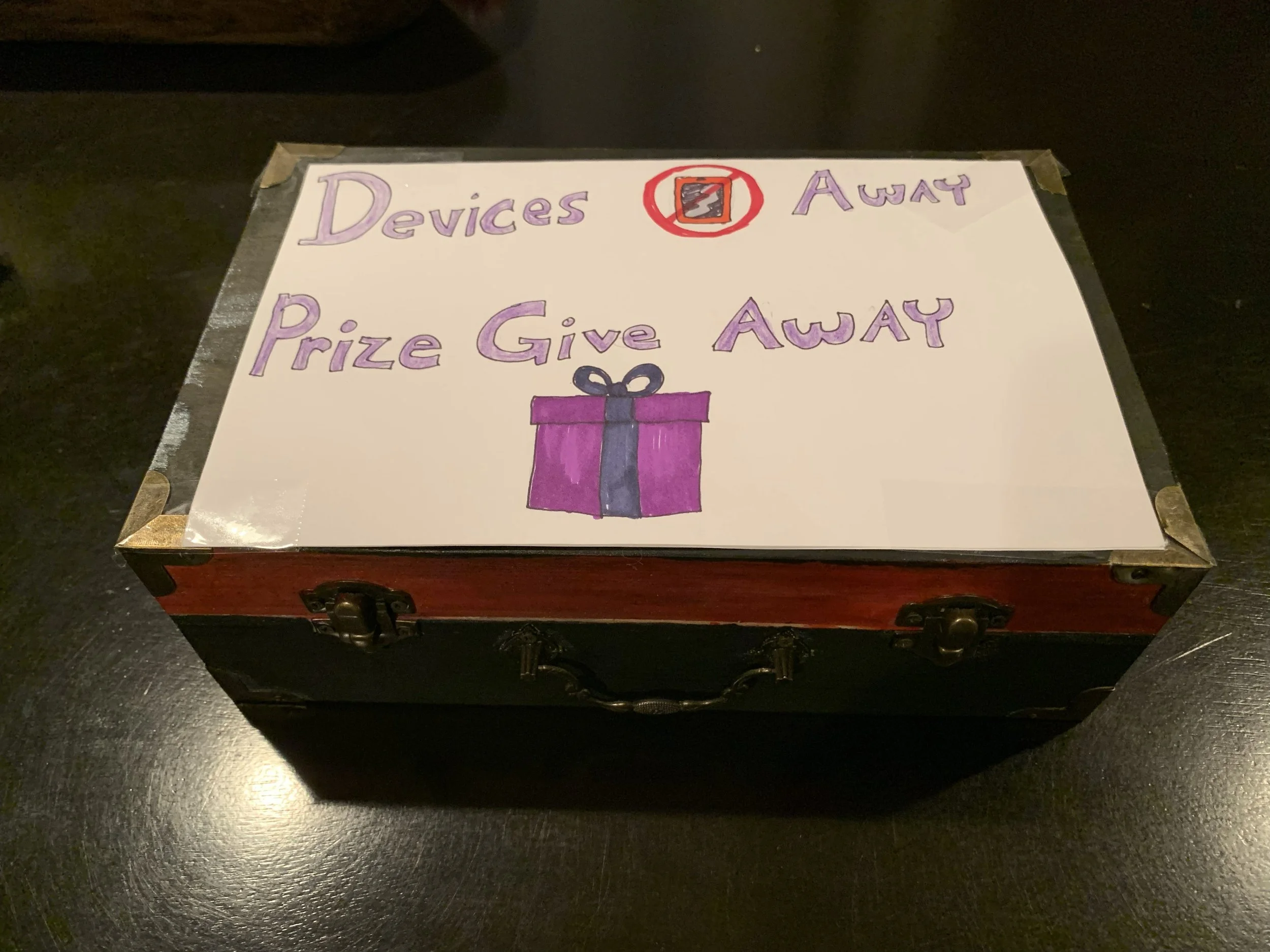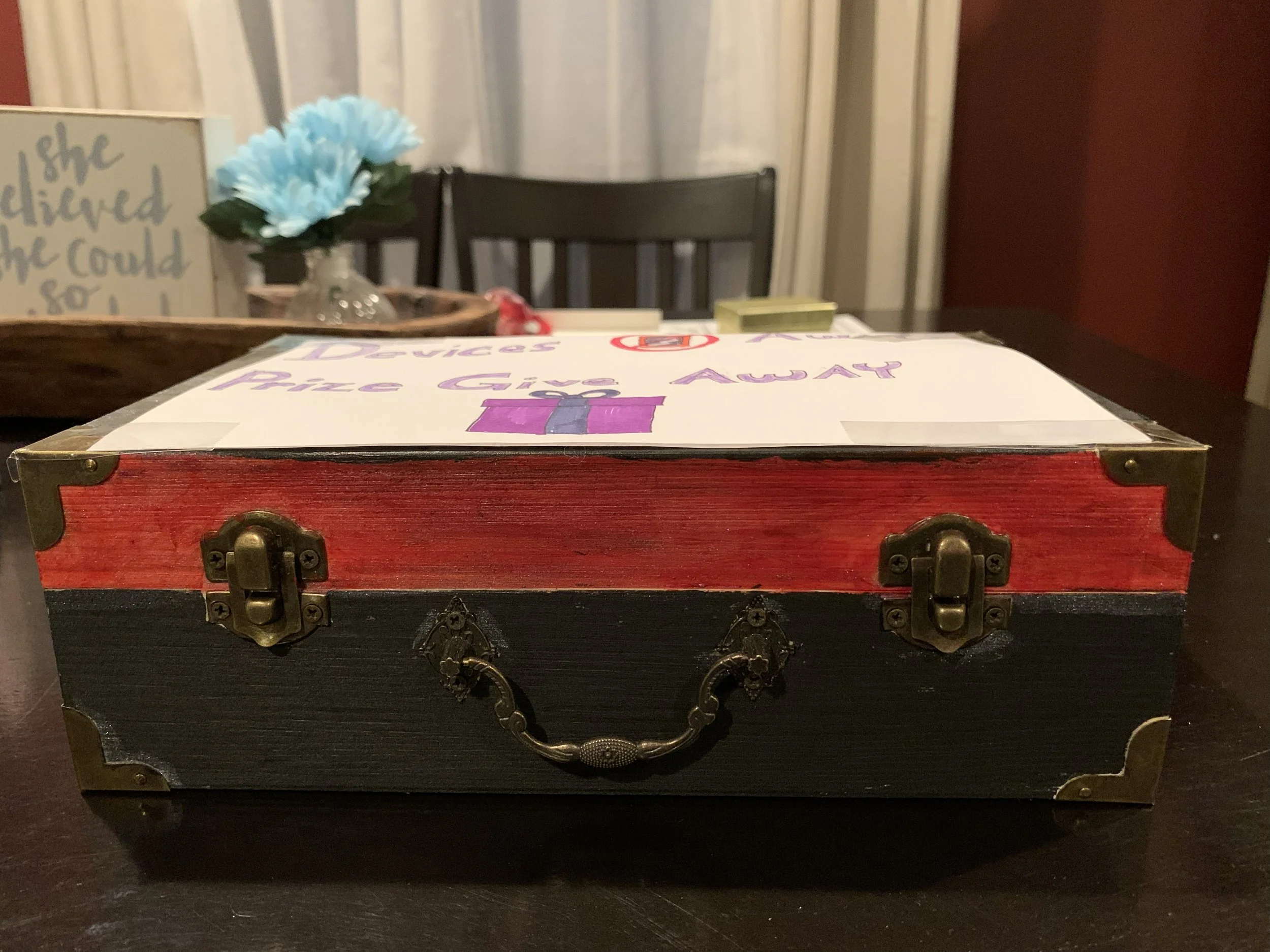 This is the final prototype, made out of a wooden box shaped like a chest. It is painted black and red as it fits most restaurant color schemes. On top is a sign for the program called “Devices Away, Prize Give Away.” This helps users understand how the program works, and if they participate, they can win a prize for their next visit. What changed from the previous prototypes is that we took out the sensor button and counter on the back because we didn’t have the material or money to create a very high-fidelity prototype.
