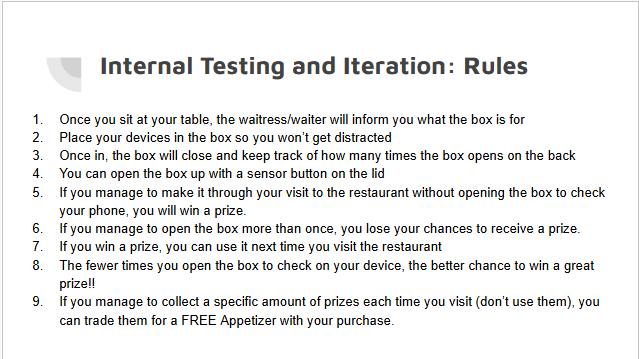 The project we decided on was to implement a ‘No Device Program’ in which customers can participate. Users who participate will put their devices away for the duration of their visit. The number of times they look at their devices will alter their ability to receive a prize. Below are the rules for the participants in the program.