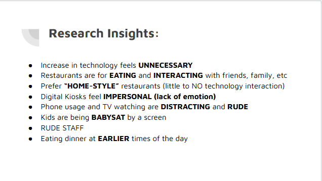 At the beginning of the initial research, we designed a sequence of questions to ask different age groups. The results were similar between each one regarding the increase in technology interaction in restaurants. Below are the research insights.