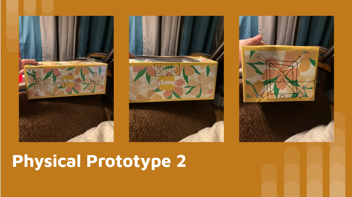 The prototype on the left is made out of an old pencil bow with paper material made up into buttons. The white cord on the side connects the mockup sensor button to the back counter for how many times the box has been opened. The prototype on the right is made out of an old tissue box, dolled up in black marker.