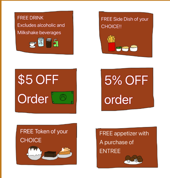 Below are mock-up sketches of the boxes and coupons. On the left was the first, original concept for the box, being an actual chest and a creative design towards the program. On the right is the redraw of the high-fidelity prototype with an improved design, including a calculator to help calculate how many times the box was opened. On the far right are ideas for potential coupon prizes for the restaurant to give away.