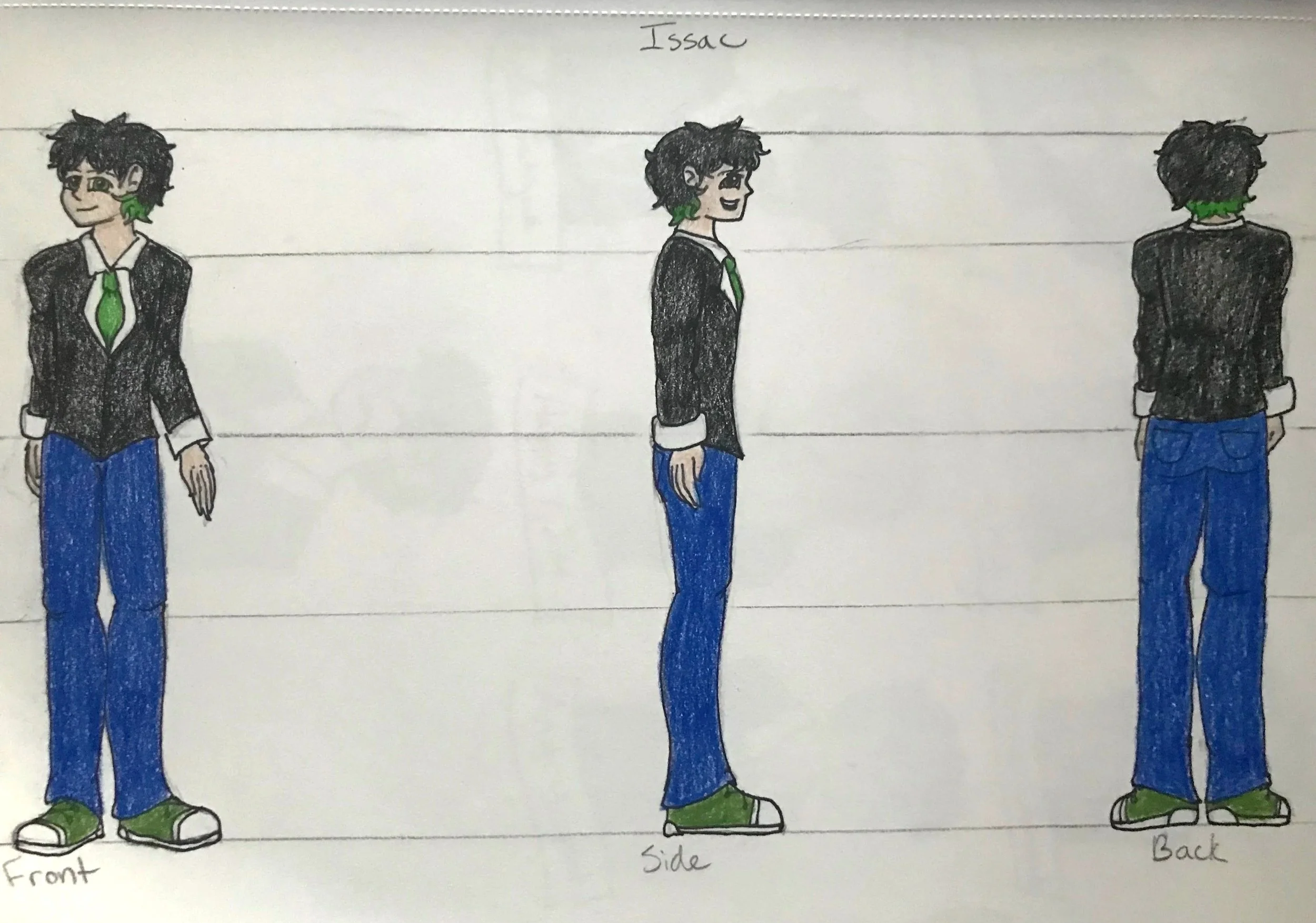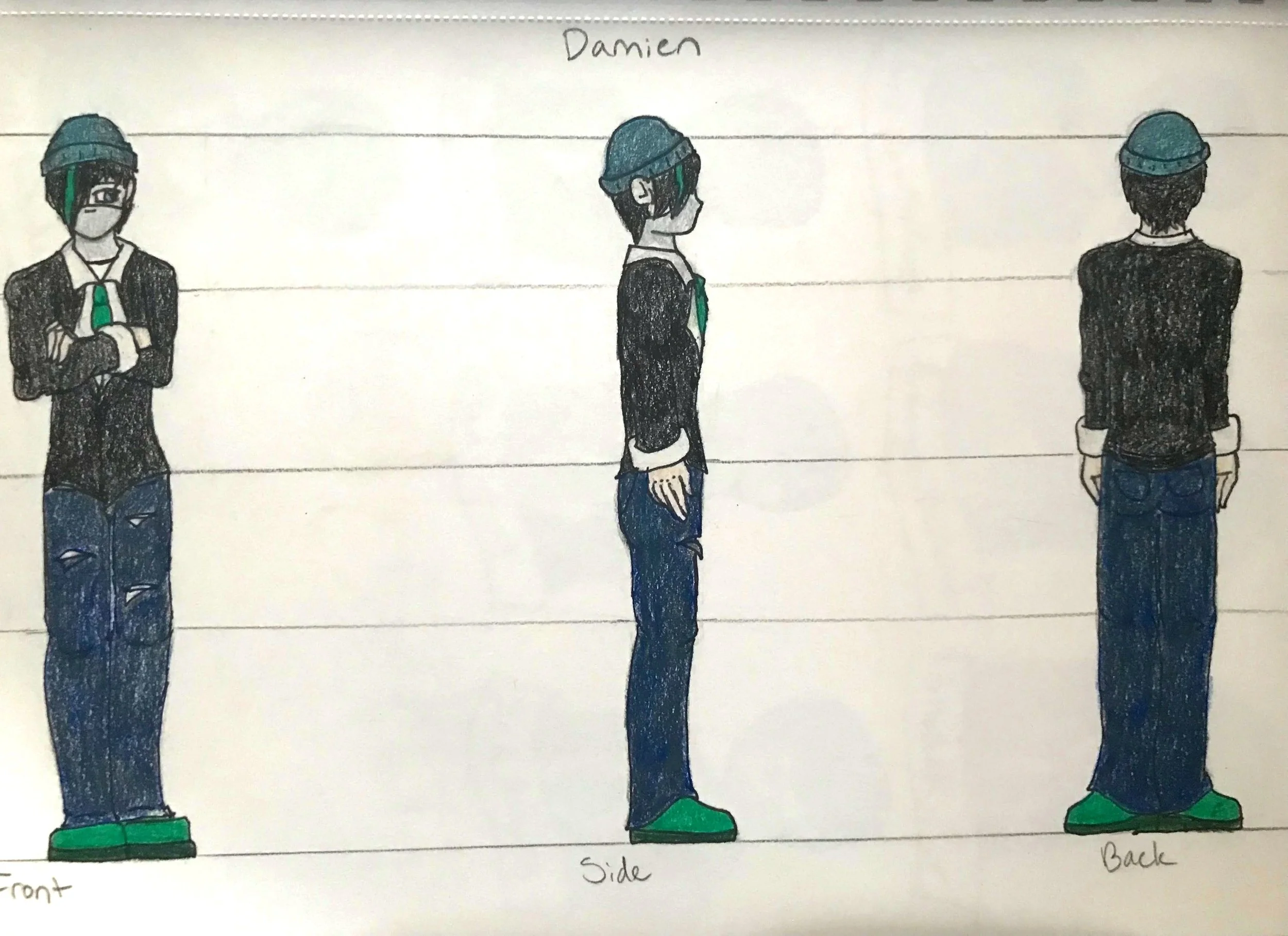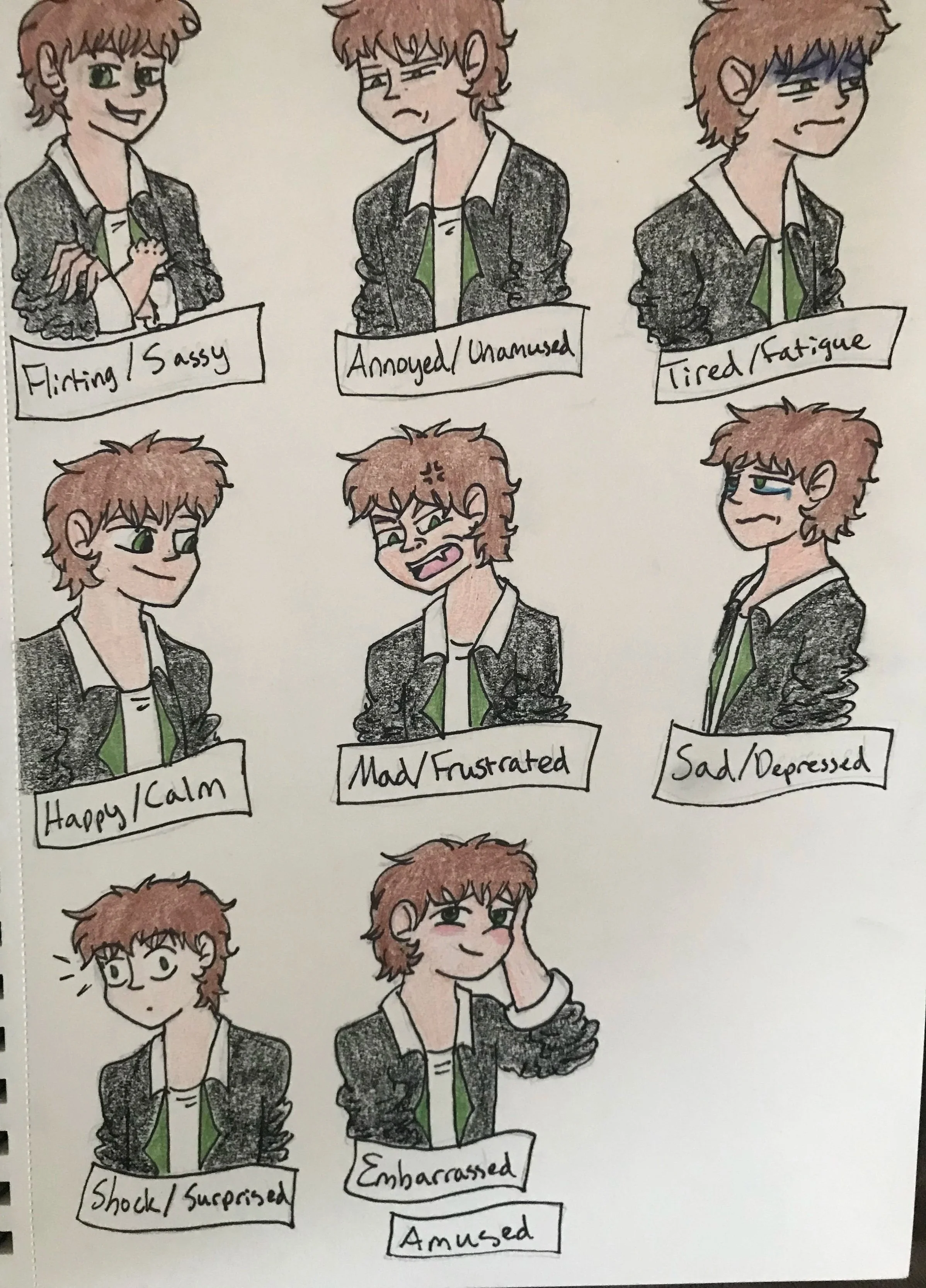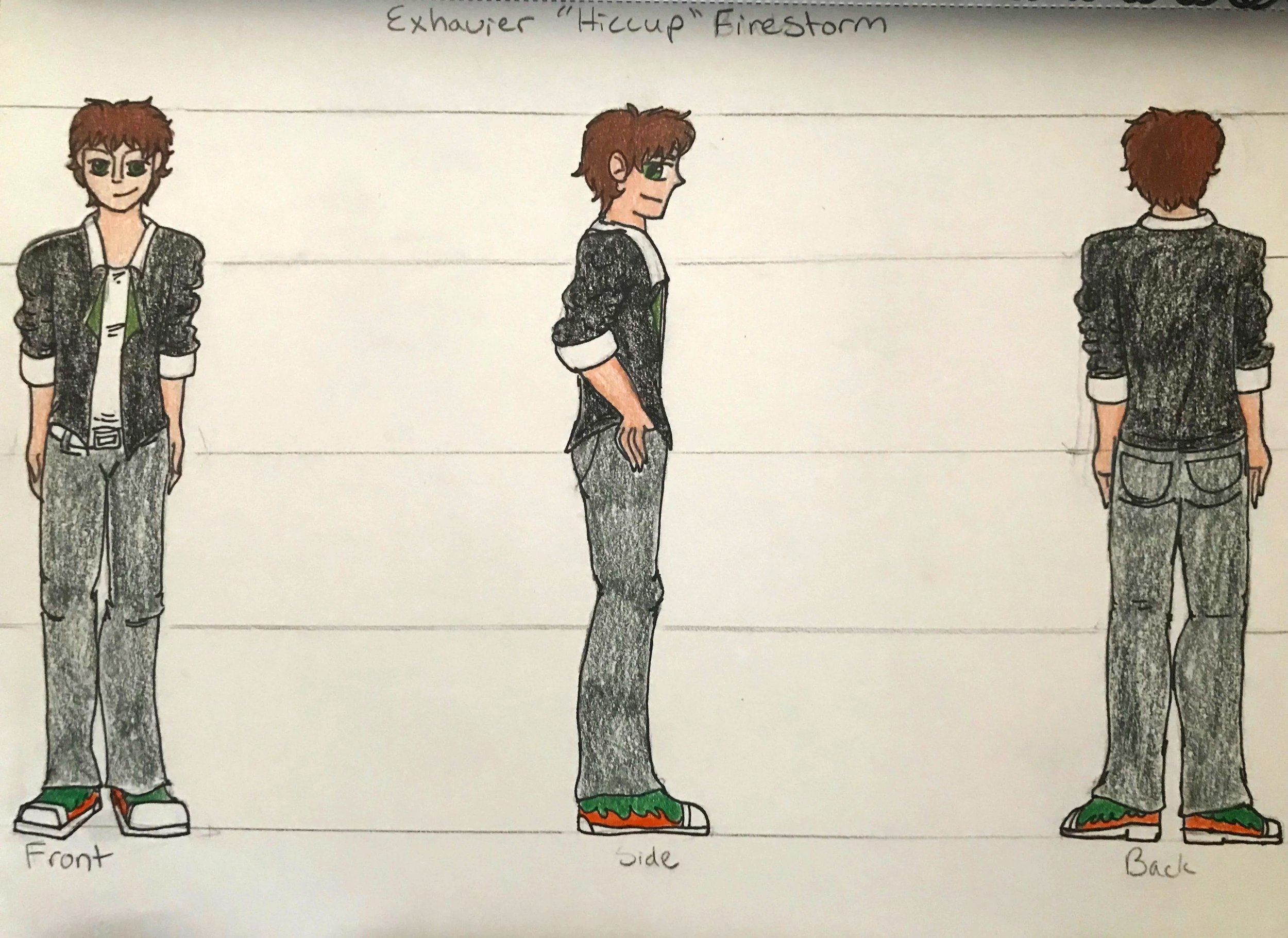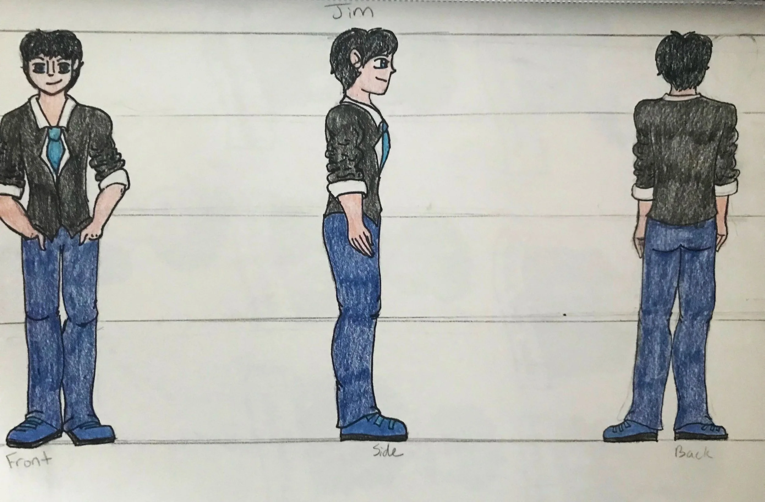 The teenage characters have two images that describe what they look like and who they are as individuals. The three-sided description sheet shows the character’s front, side, and back views. The facial expressions sheet shows each character’s main emotions throughout the story. Both sheets help show their personalities through their facial expressions, with some more than others, depending on certain aspects of the story.