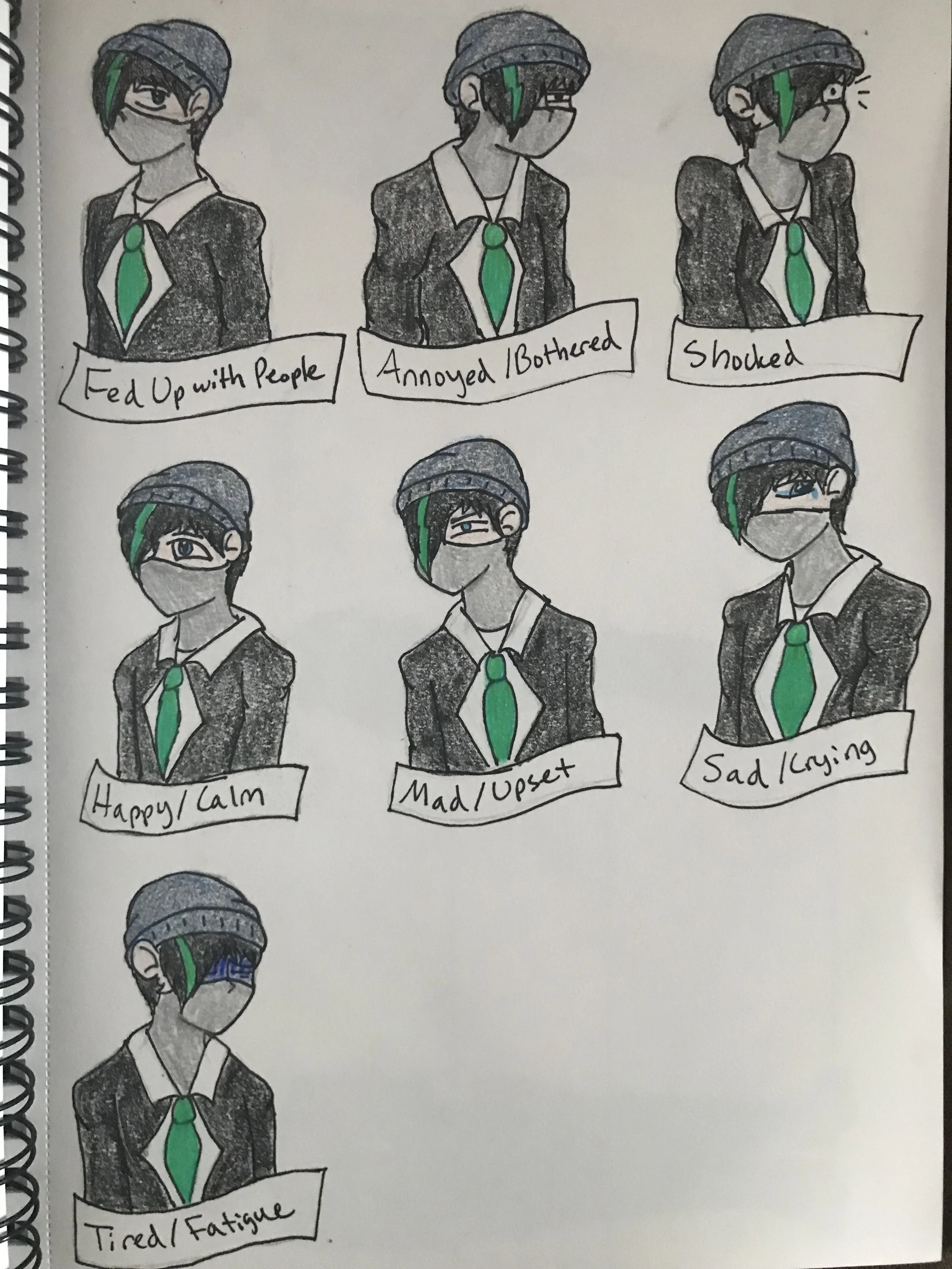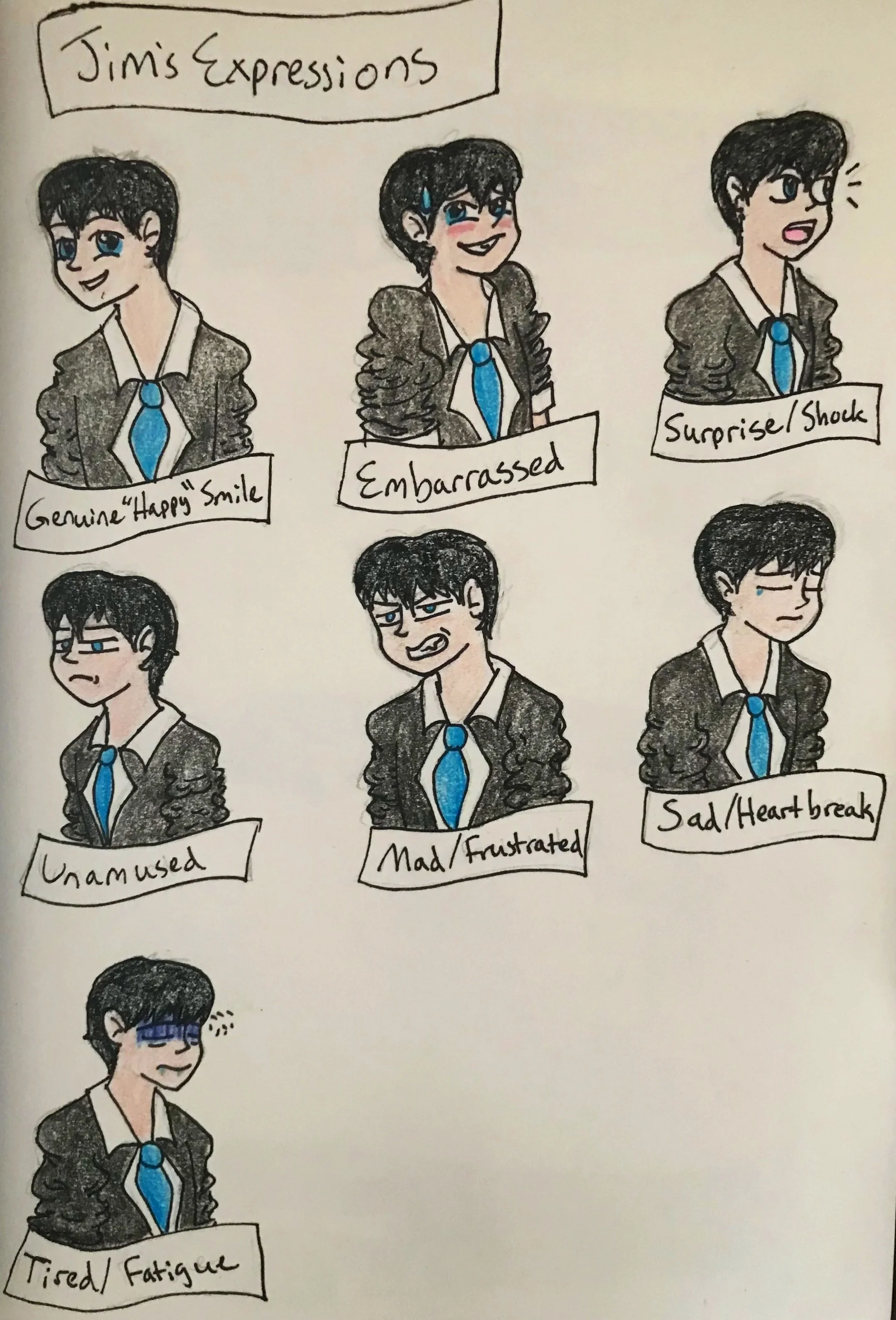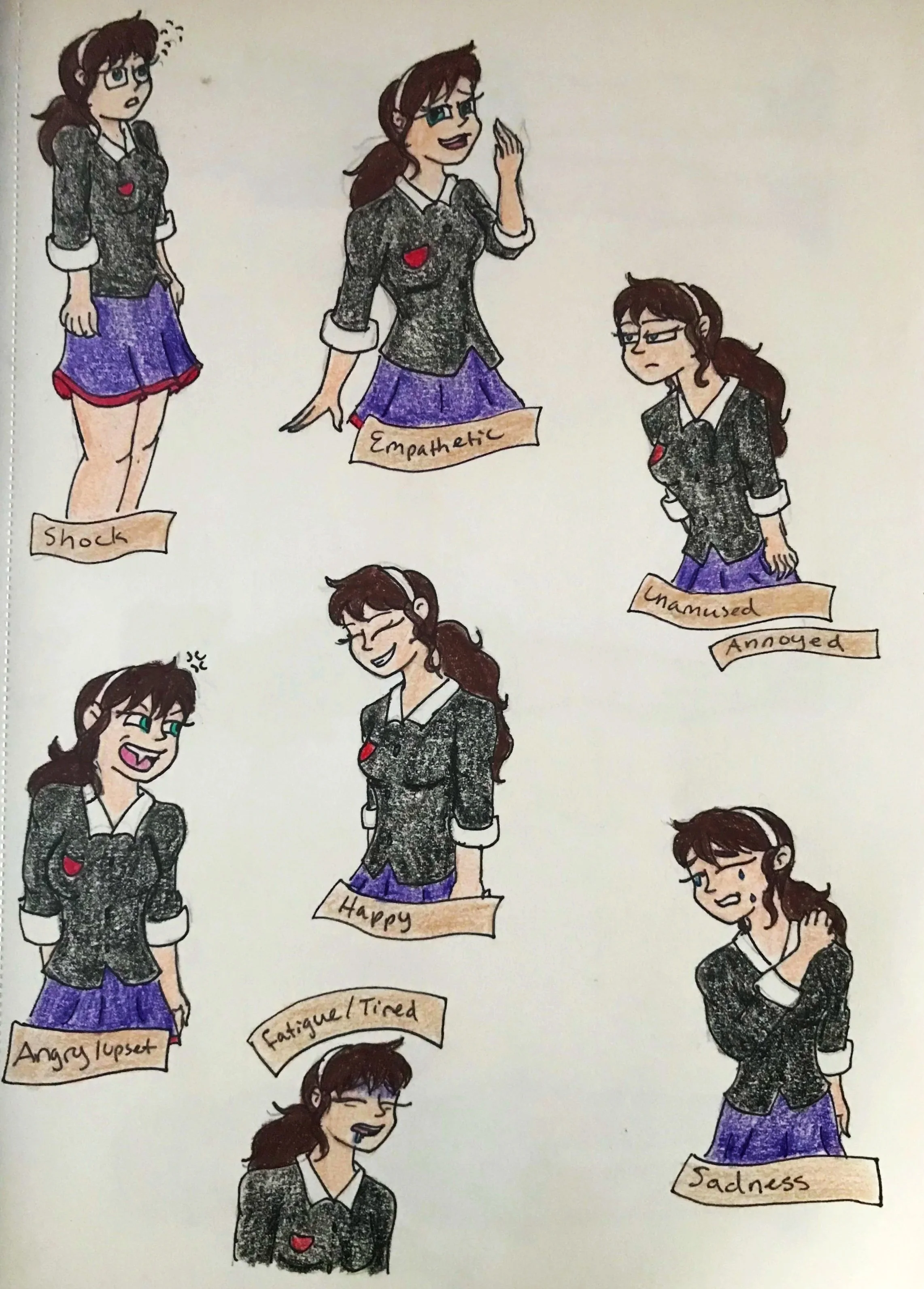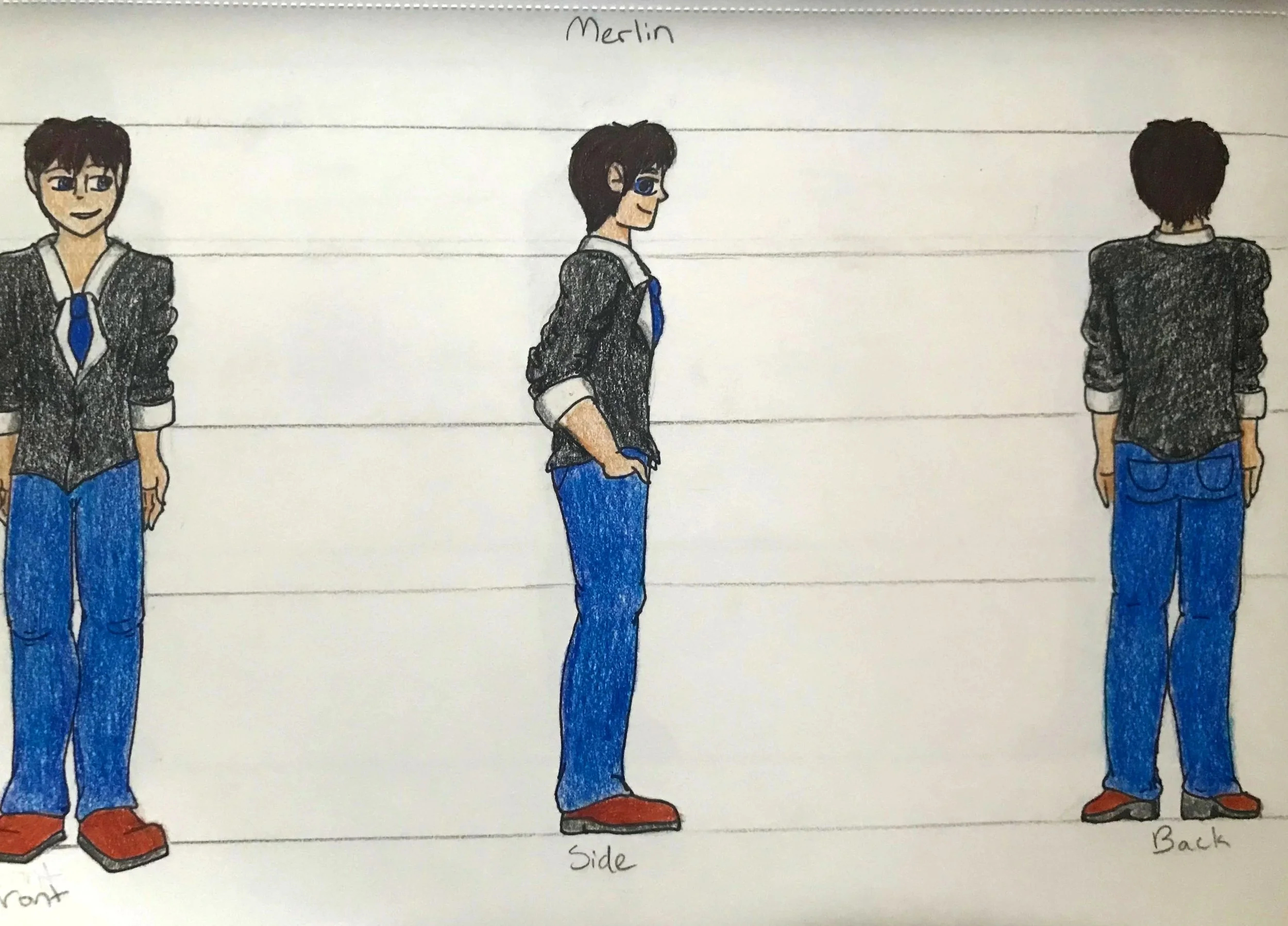 The teenage characters have two images that describe what they look like and who they are as individuals. The three-sided description sheet shows the character’s front, side, and back views. The facial expressions sheet shows each character’s main emotions throughout the story. Both sheets help show their personalities through their facial expressions, with some more than others, depending on certain aspects of the story.