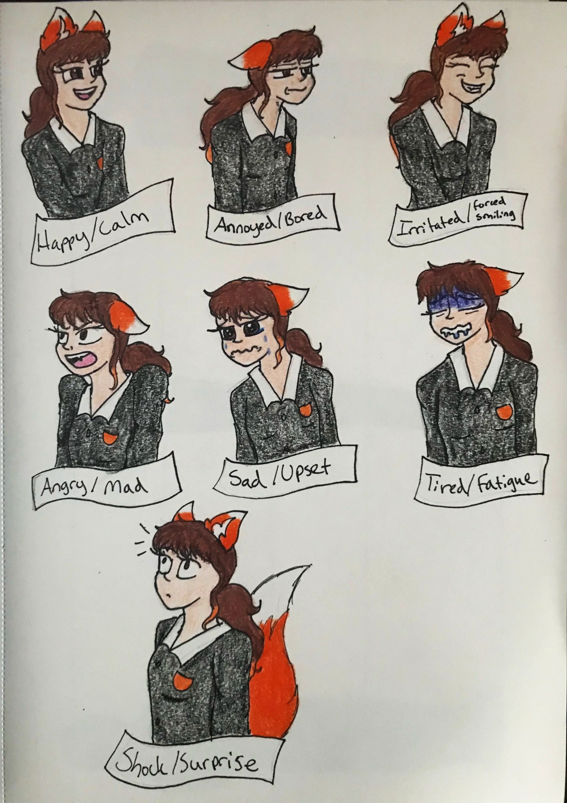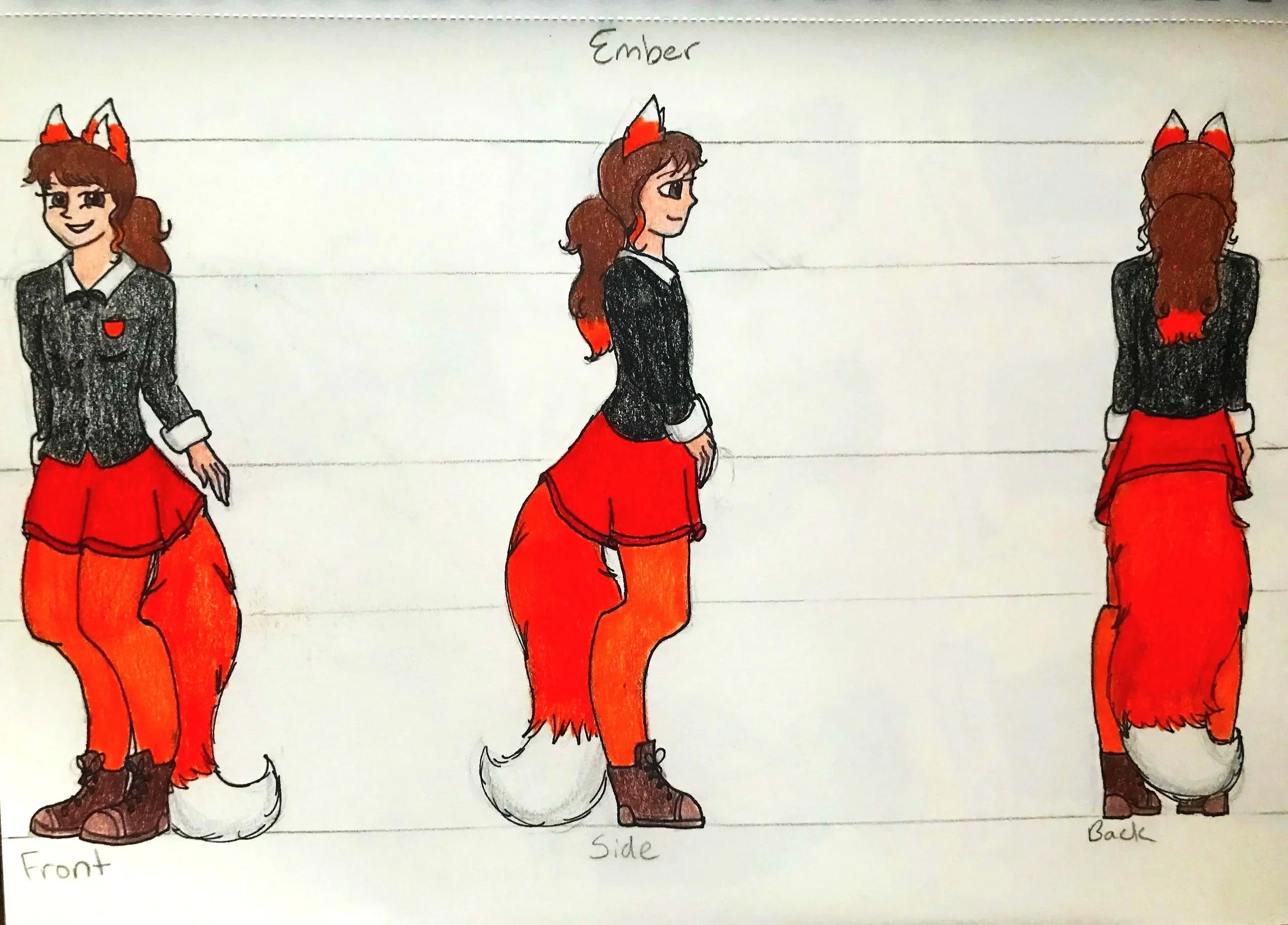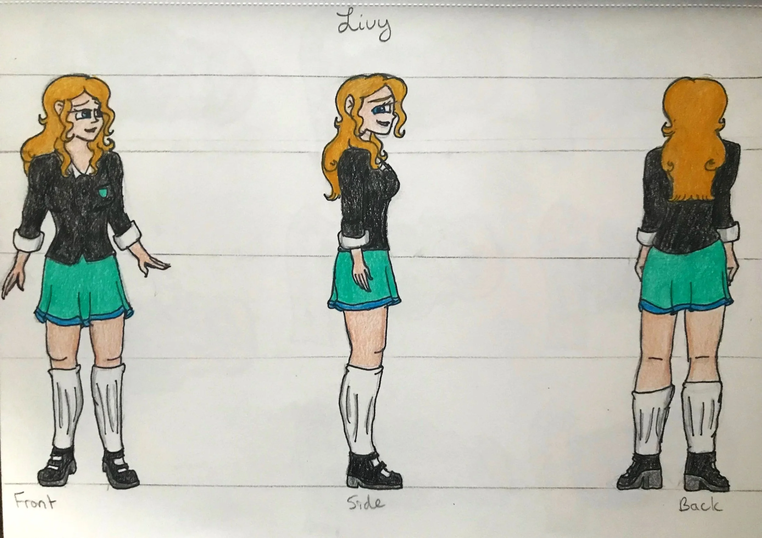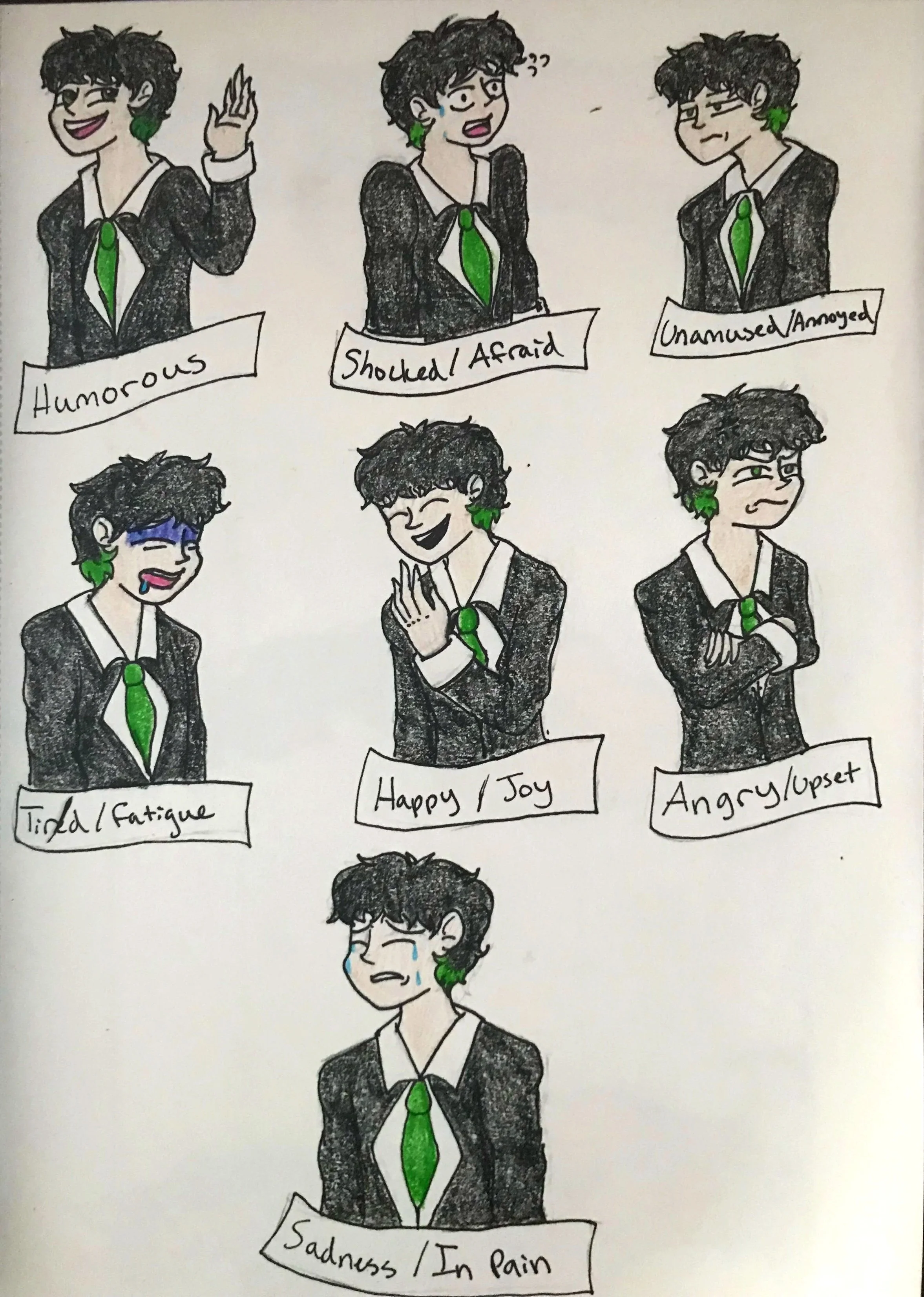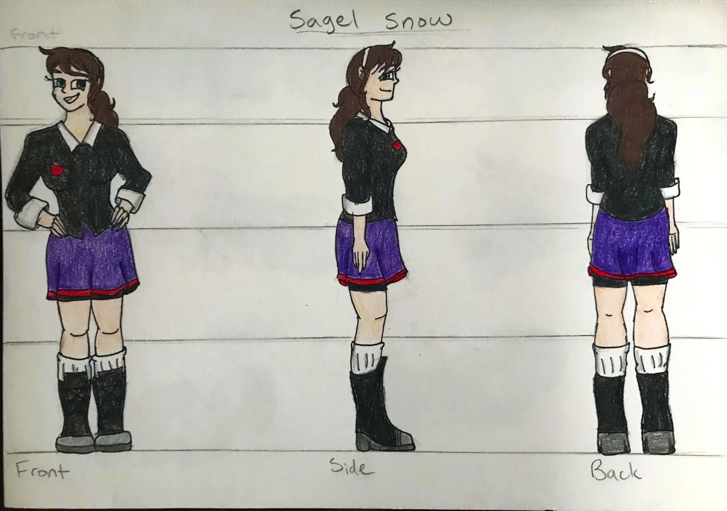 The teenage characters have two images that describe what they look like and who they are as individuals. The three-sided description sheet shows the character’s front, side, and back views. The facial expressions sheet shows each character’s main emotions throughout the story. Both sheets help show their personalities through their facial expressions, with some more than others, depending on certain aspects of the story.